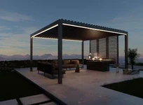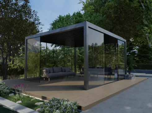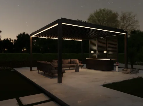 Pergolas can be integrated with Feal sliding walls type FR-18, creating an elegant transition between indoor and outdoor spaces.
